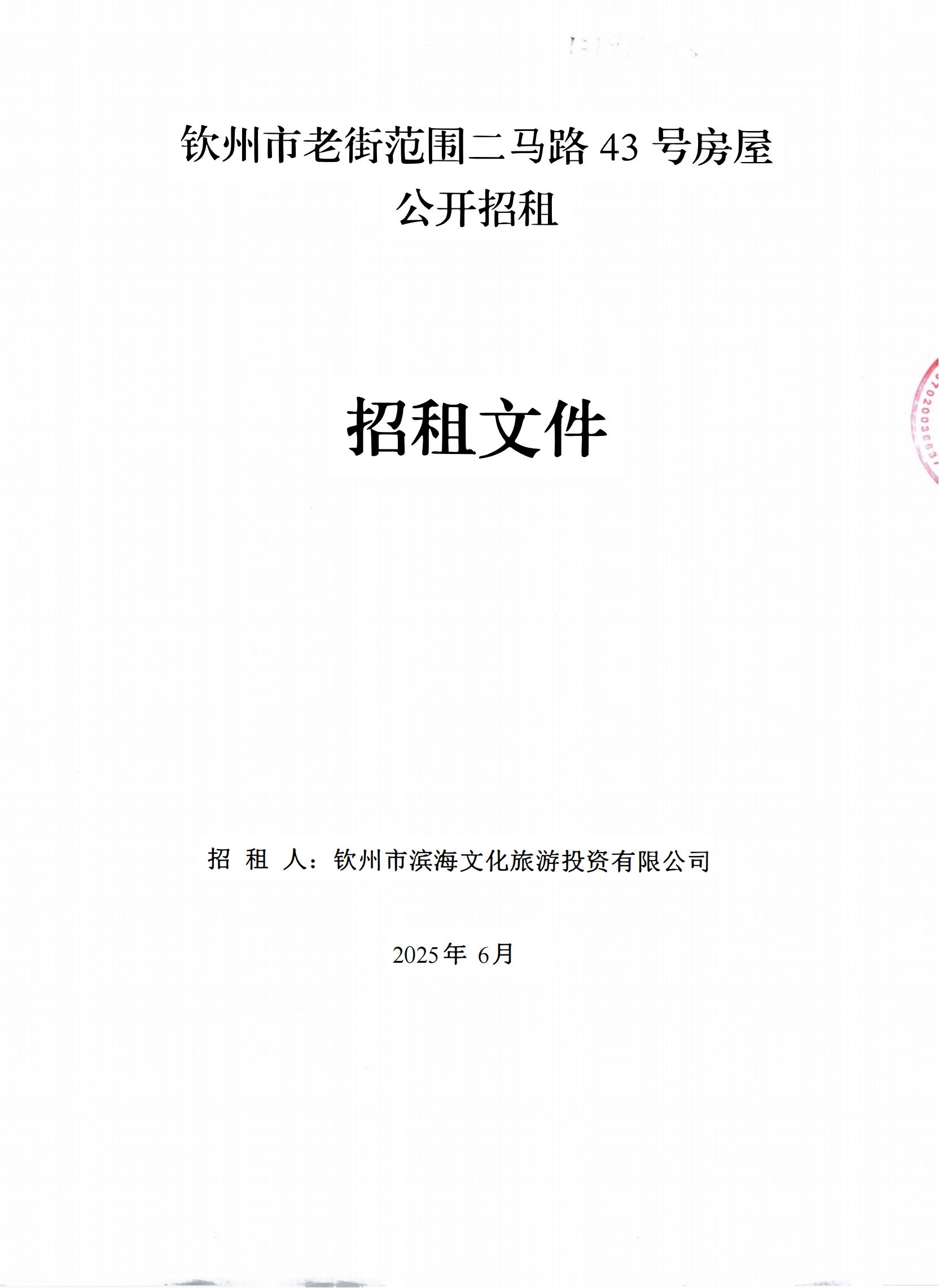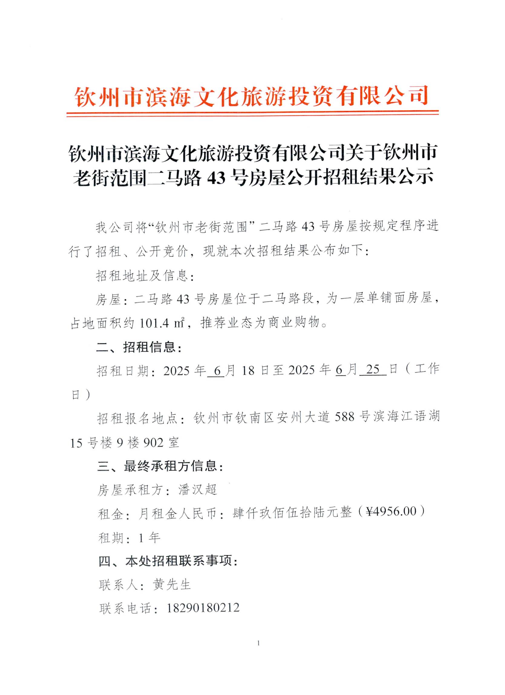 欽州市濱海文化旅游投資有限公司關(guān)于欽州市老街范圍二馬路43號(hào)房屋公開招租結(jié)果公示