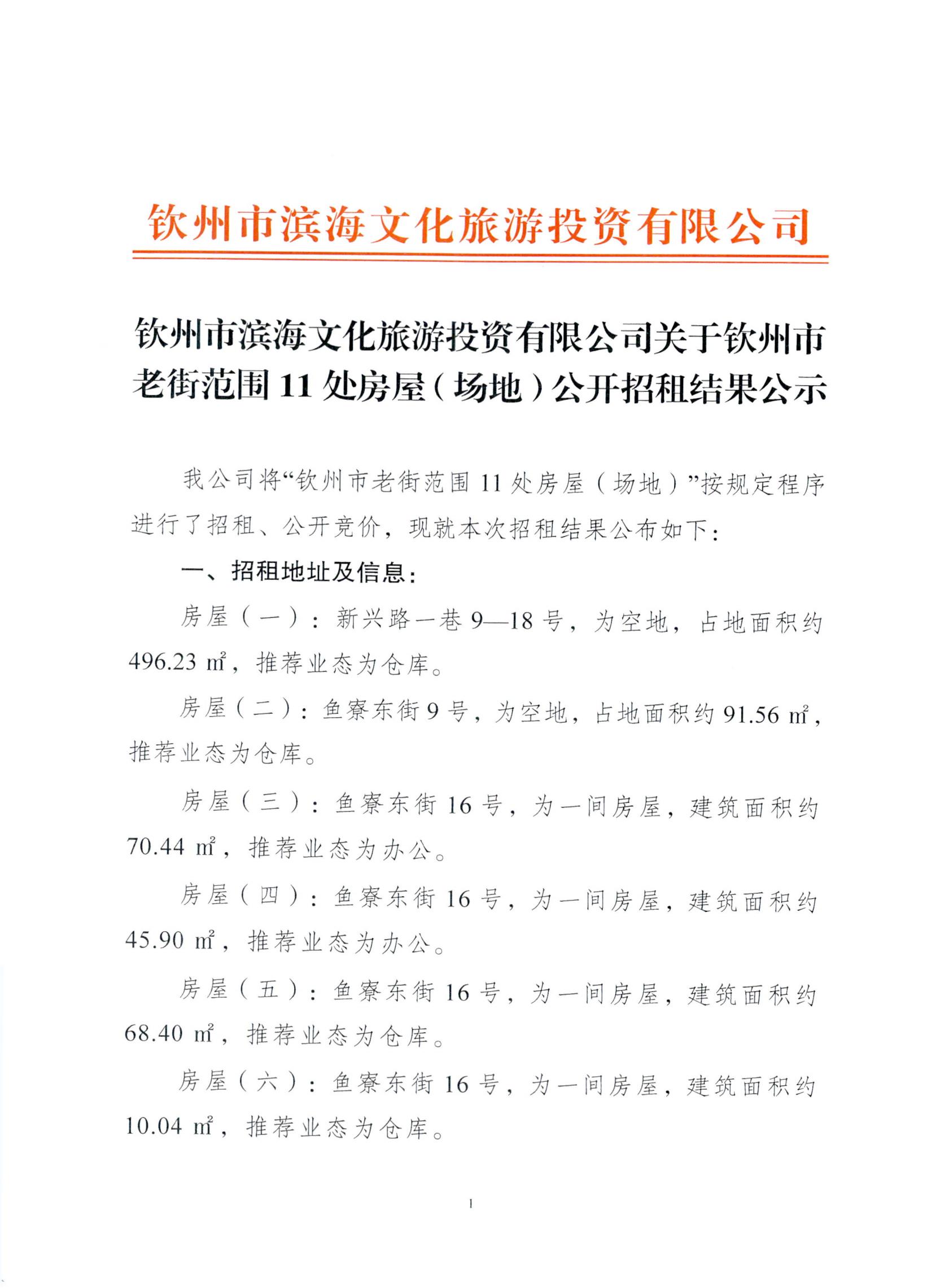 欽州市濱海文化旅游投資有限公司關(guān)于欽州市老街范圍11處房屋(場地)公開招租結(jié)果公示