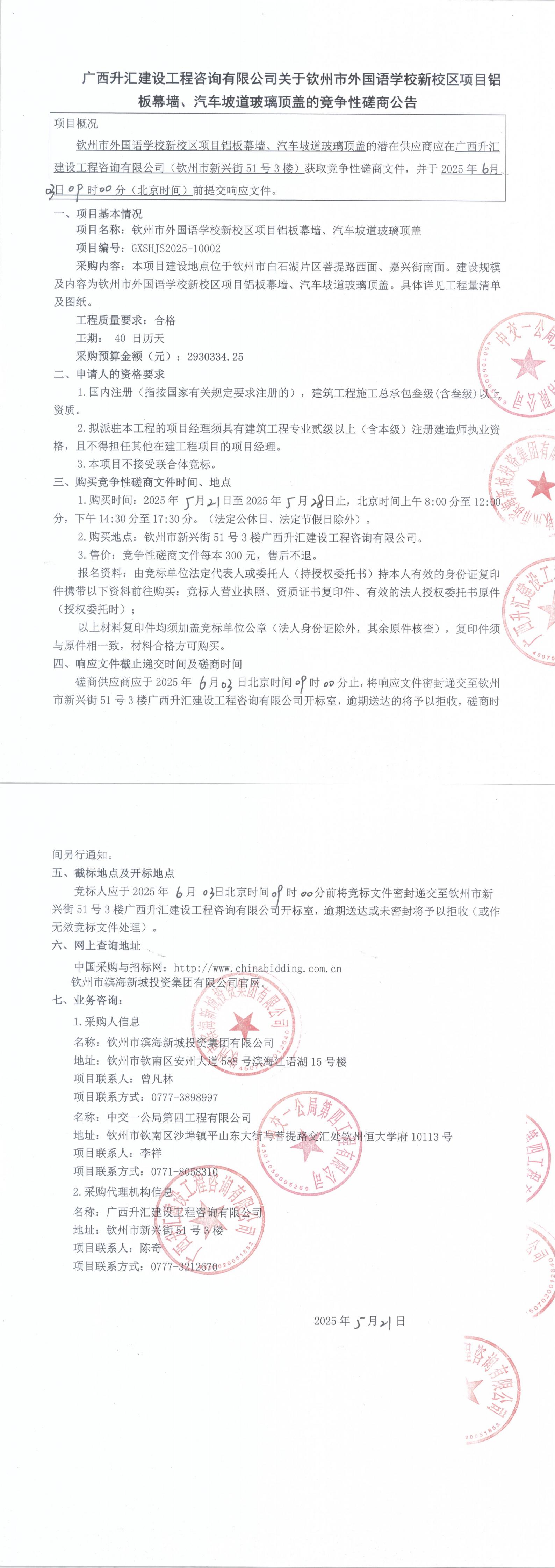 廣西升匯建設工程咨詢有限公司關于欽州市外國語學校新校區(qū)項目鋁板幕墻、汽車坡道玻璃頂蓋的競爭性磋商公告