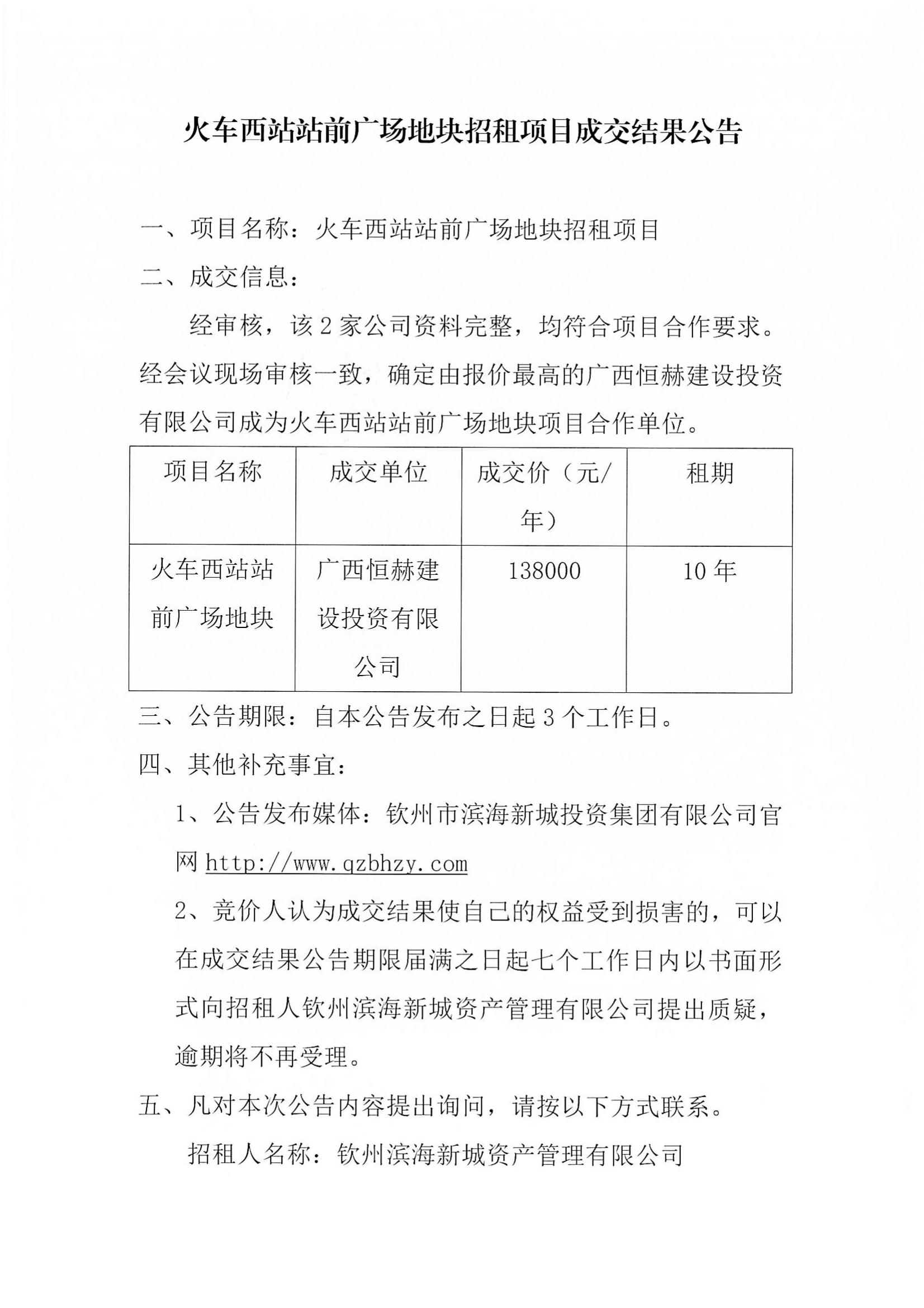 火車西站站前廣場地塊招租項目成交結果公告