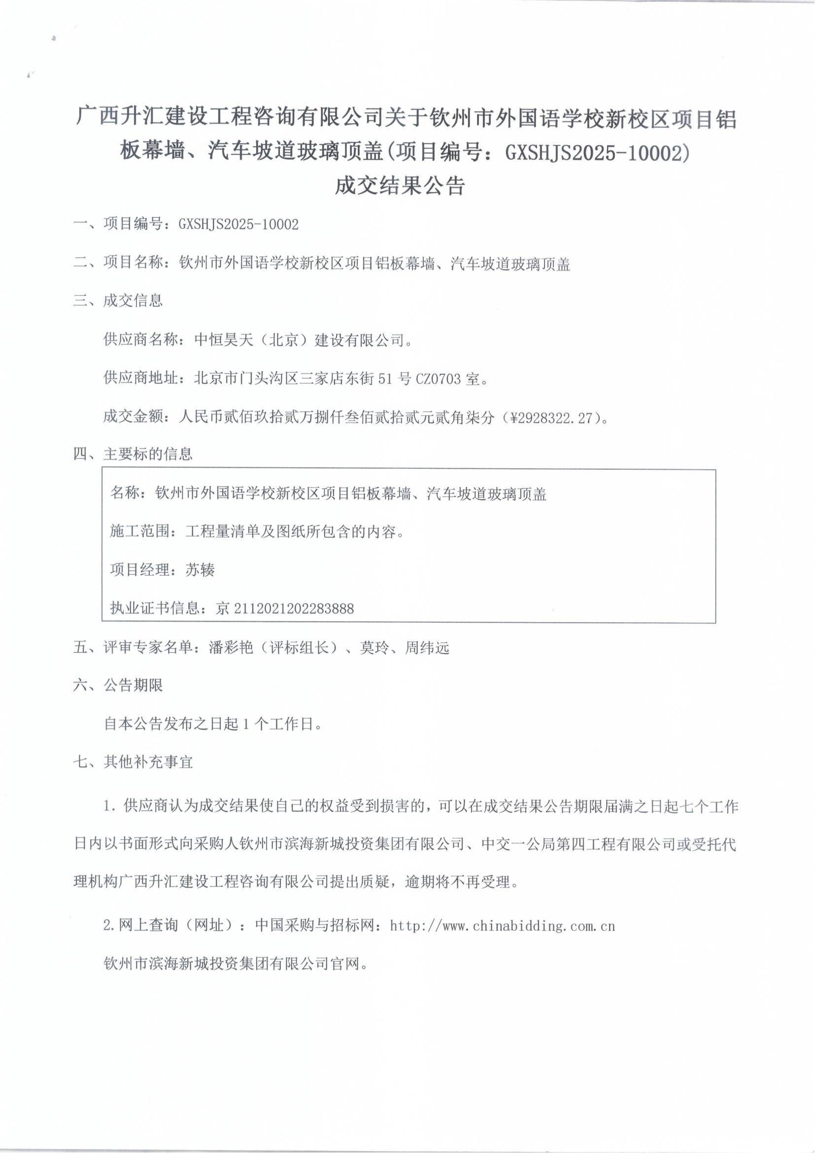 成交結果公告(欽州市外國語學校新校區(qū)項目材料暫估價)