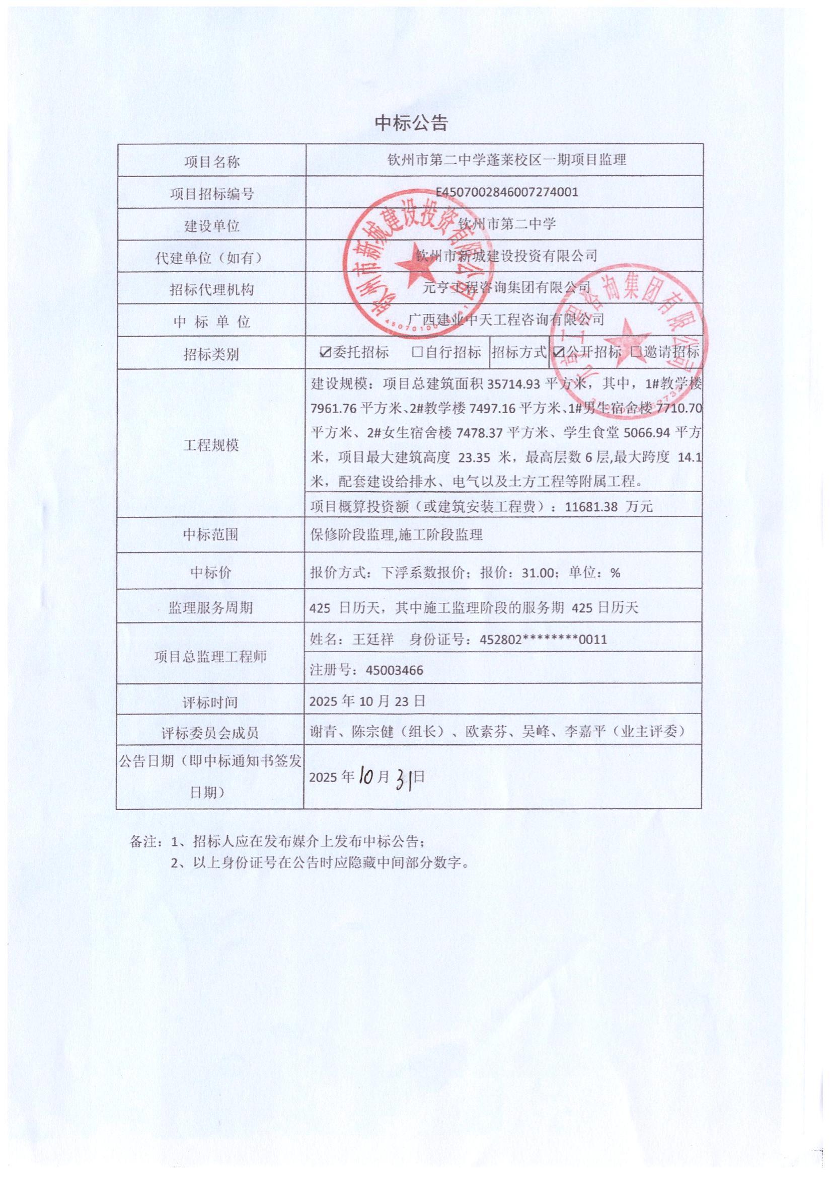 中標(biāo)公告(欽州市第二中學(xué)蓬萊校區(qū)一期項目監(jiān)理)