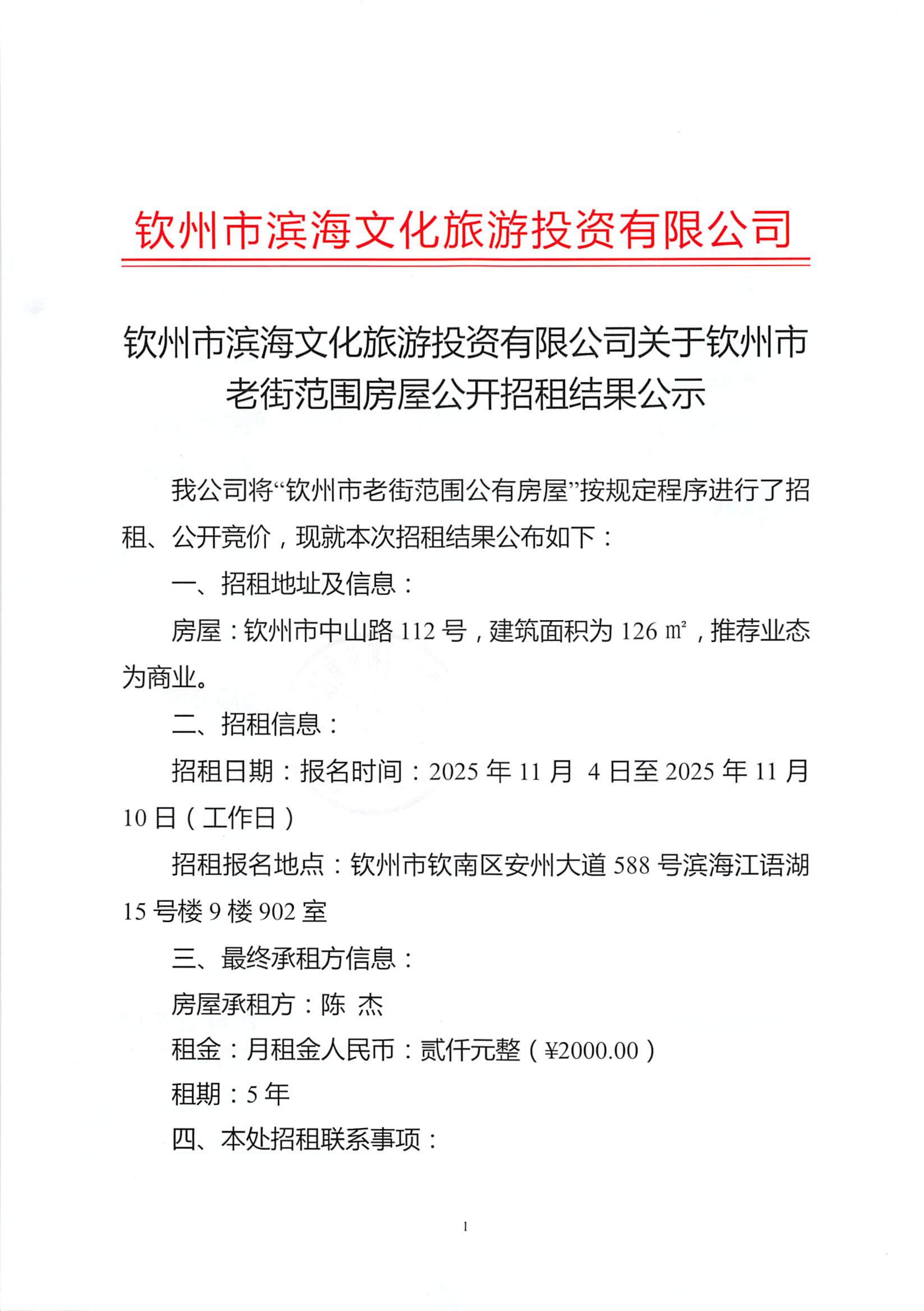 欽州市濱海文化旅游投資有限公司關(guān)于欽州市老街范圍房屋公開招租結(jié)果公示(欽州市中山路112號)