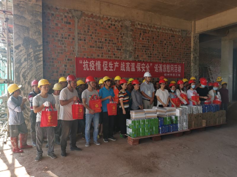 7月13日,欽州市總工會調(diào)研員黃春雯等一行到我集團公司負責建設的欽州是茅尾海監(jiān)控監(jiān)測管理基地項目現(xiàn)場,開展“抗疫情 促生產(chǎn) 戰(zhàn)高溫”送清涼慰問活動。在炎炎夏日,為現(xiàn)場辛勤勞作的農(nóng)民工獻上一份清涼。致謝每一位在一線工作的人員,感謝他們?yōu)槲覀兂鞘邪l(fā)展貢獻一份力量。