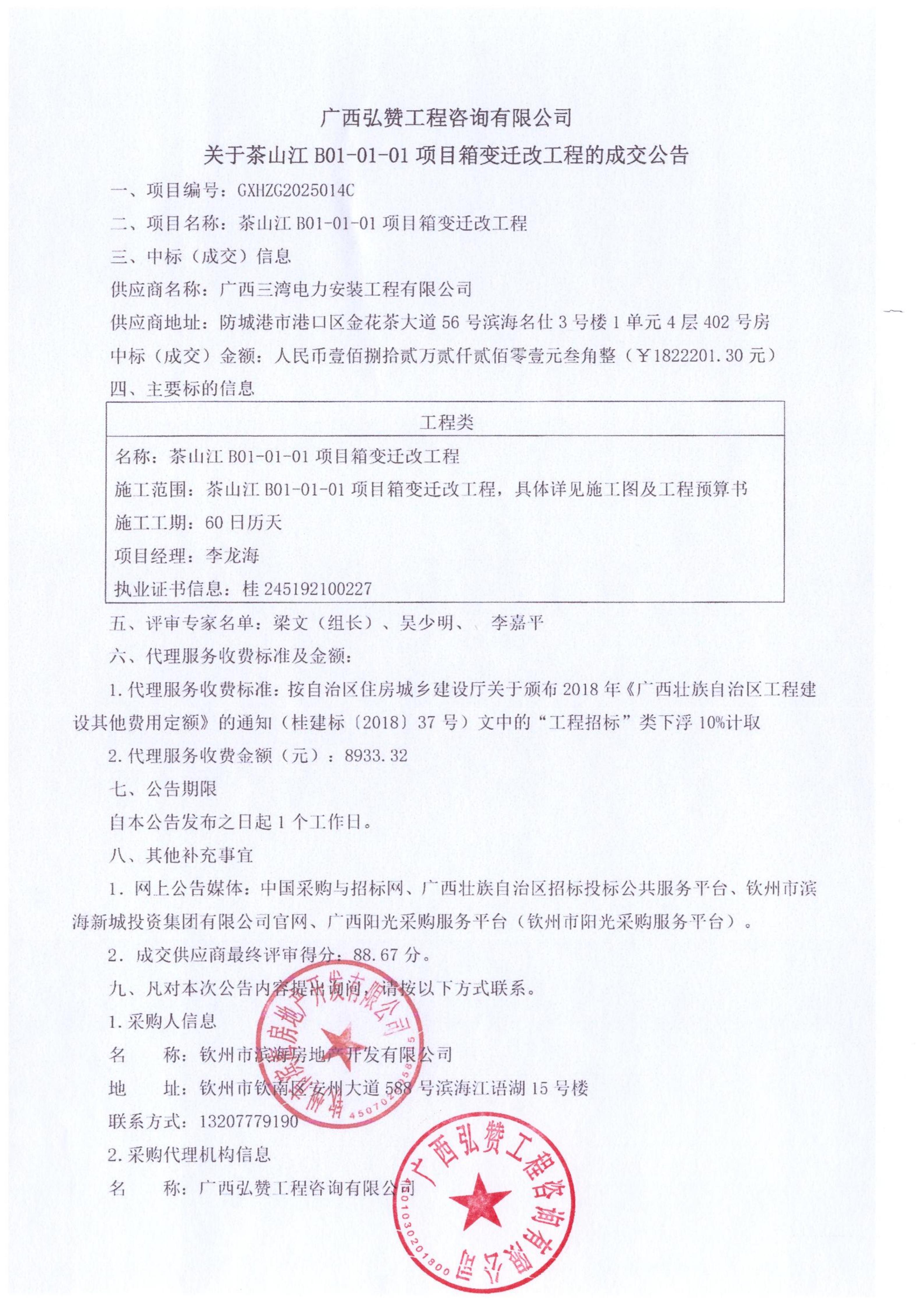 茶山江B01-01-01項(xiàng)目箱變遷改工程成交公告