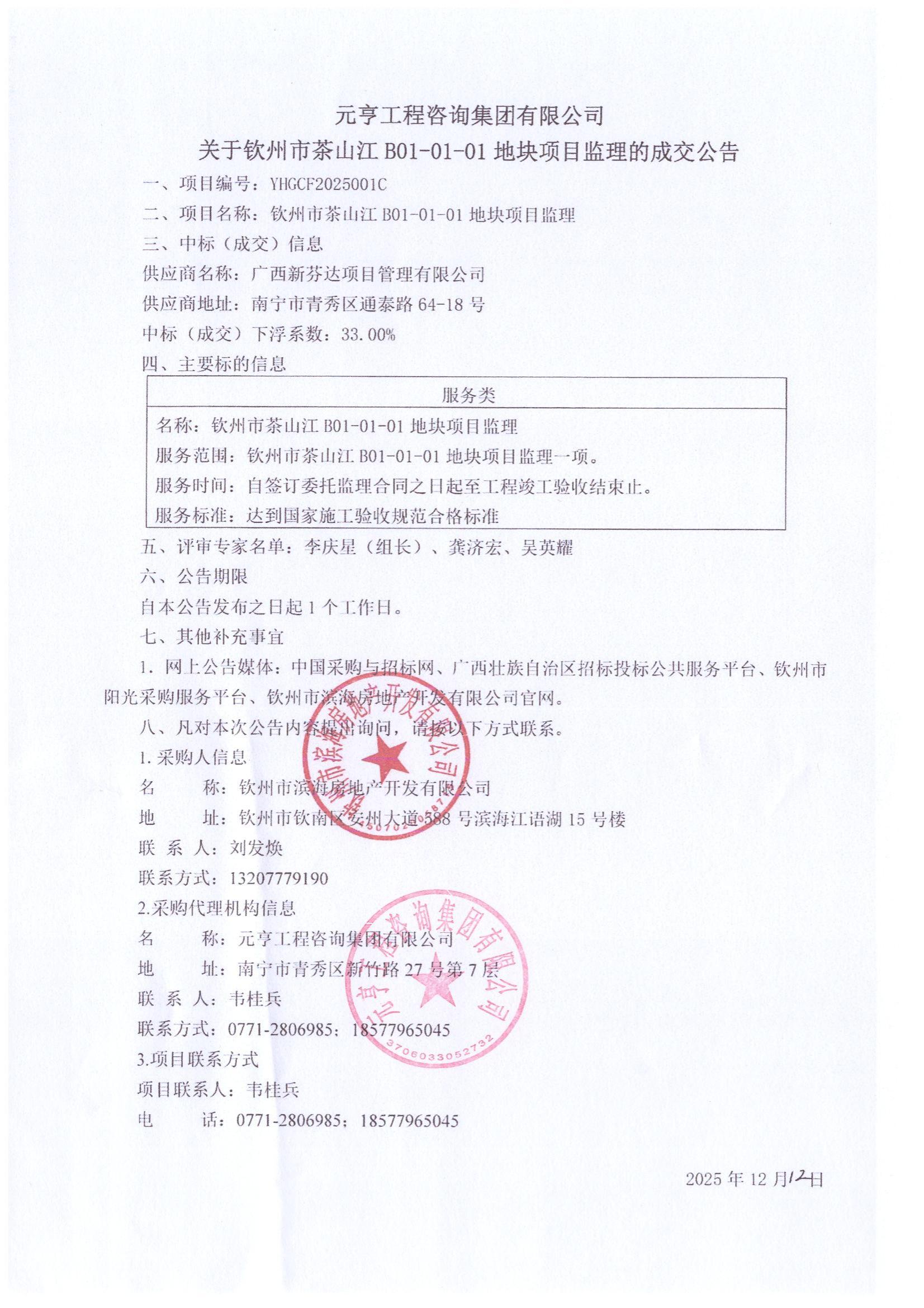 欽州市茶山江 B01-01-01地塊項(xiàng)目監(jiān)理的成交公告