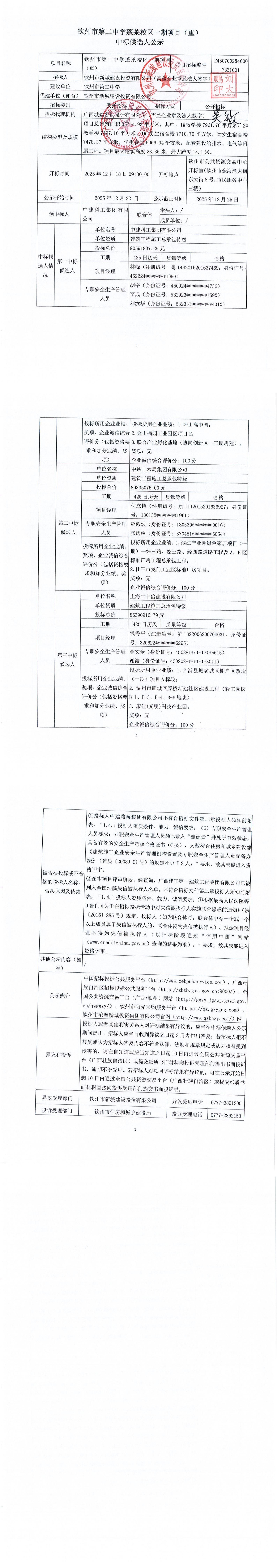 中標(biāo)候選人公示-欽州市第二中學(xué)蓬萊校區(qū)一期項(xiàng)目(重)
