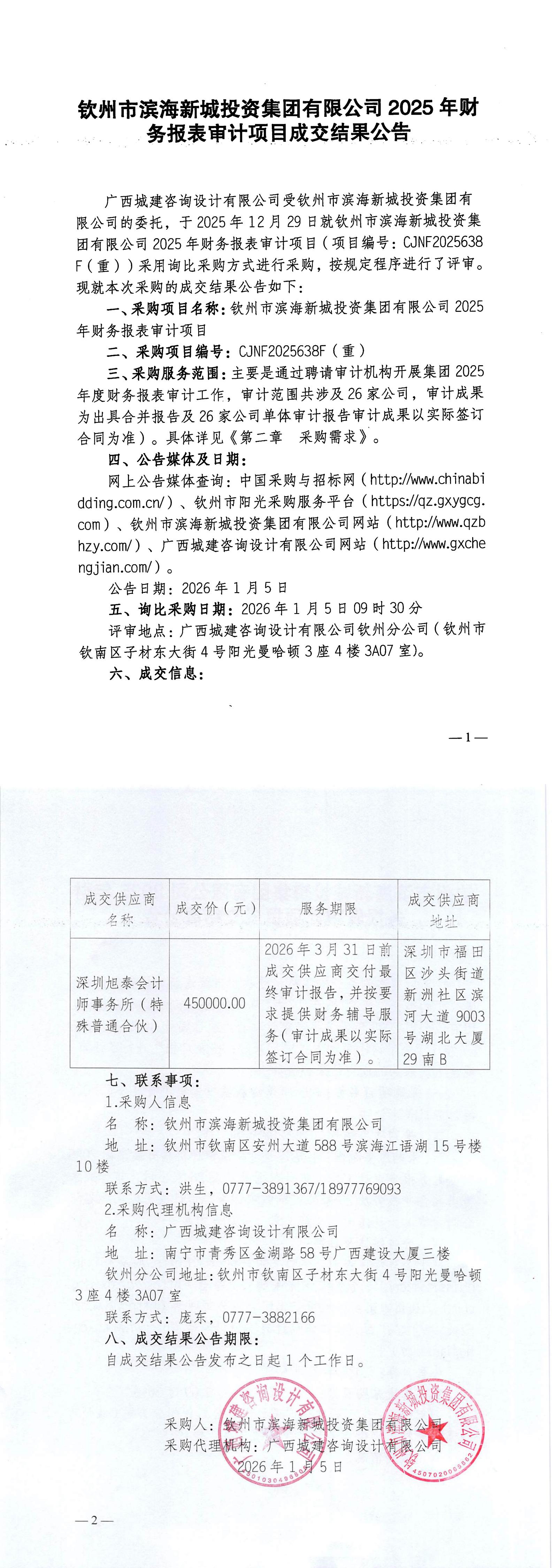 欽州市濱海新城投資集團(tuán)有限公司2025年財(cái)務(wù)報(bào)表審計(jì)項(xiàng)目成交結(jié)果公告