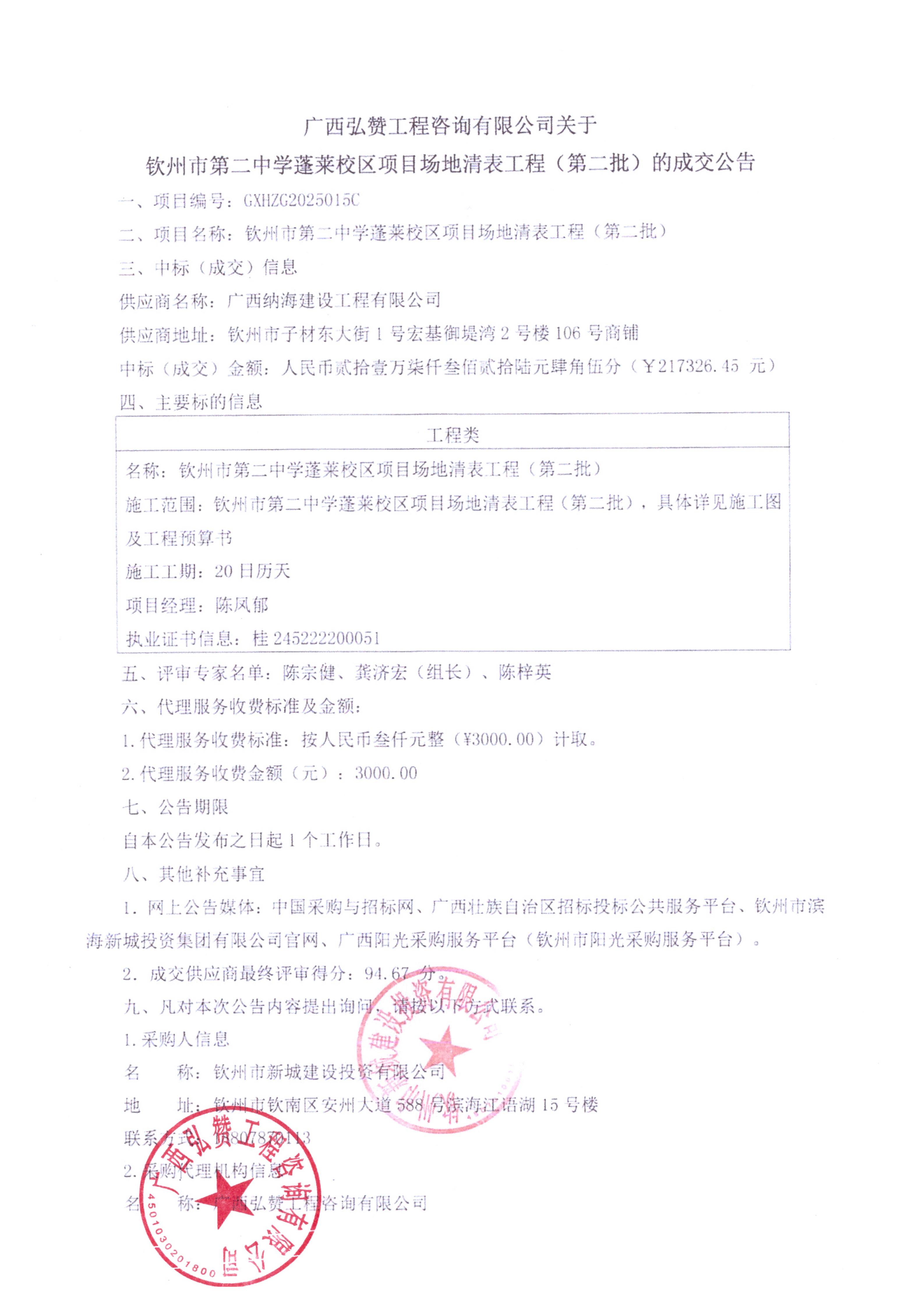 欽州市第二中學(xué)蓬萊校區(qū)項(xiàng)目場地清表工程(第二批)成交公告