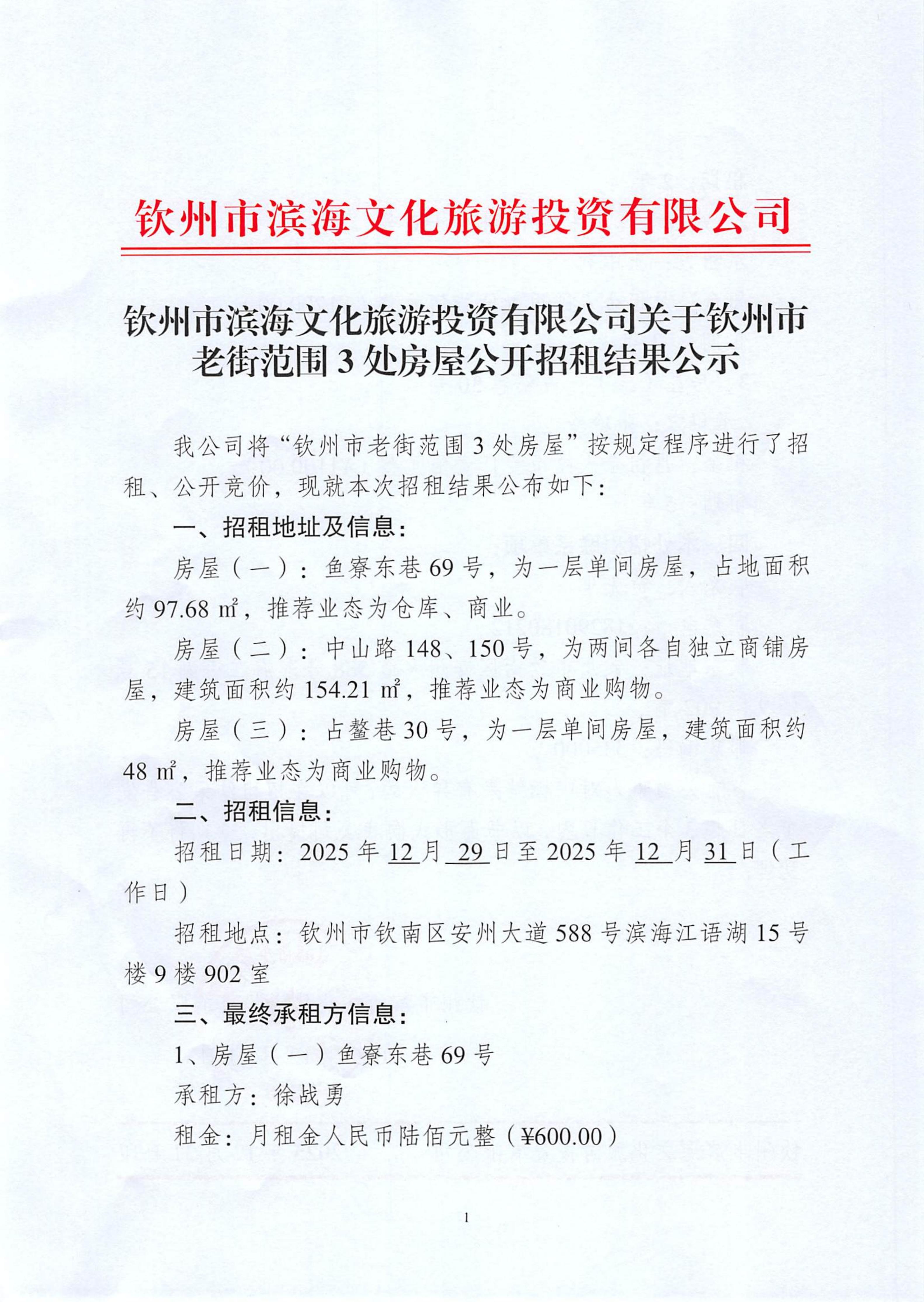 欽州市濱海文化旅游投資有限公司關(guān)于欽州市老街范圍3處房屋公開招租結(jié)果公示