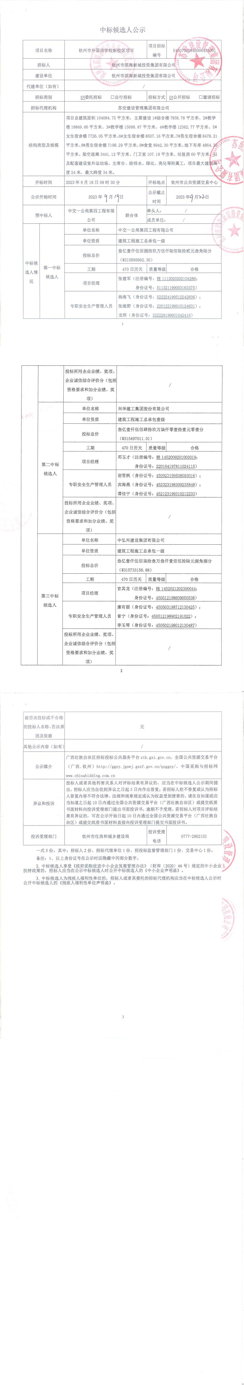 欽州市外國語學(xué)校新校區(qū)項目工程檢測中標候選人公示