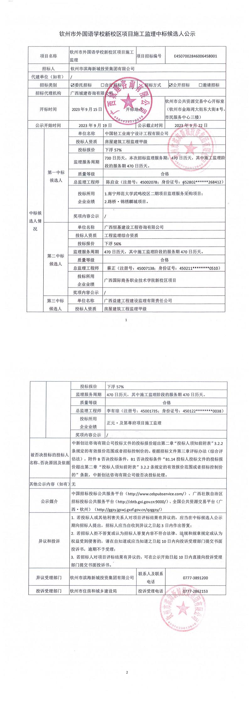 欽州市外國語學(xué)校新校區(qū)項目施工監(jiān)理中標候選人公示