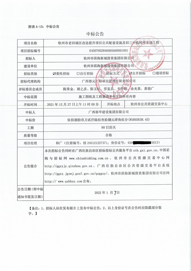 中標(biāo)公告-欽州市老舊城區(qū)改造提升項(xiàng)目公共配套設(shè)施及舊三中臨時(shí)停車場工程