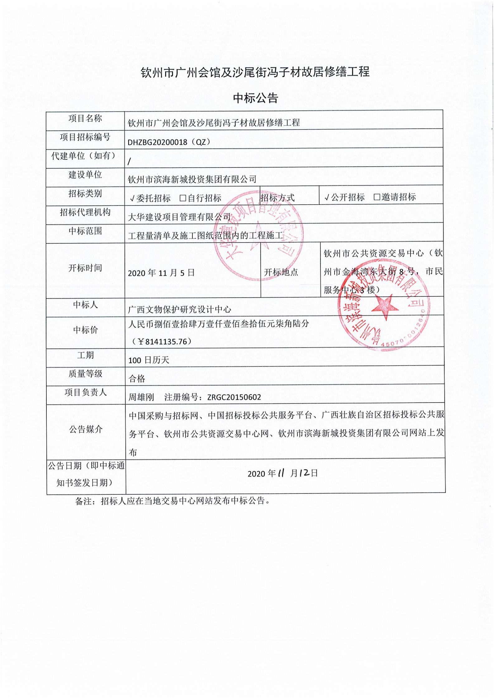 欽州市廣州會(huì)館及沙尾街馮子材故居修繕工程中標(biāo)公告