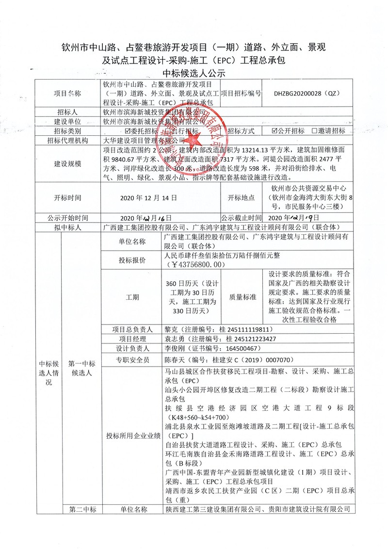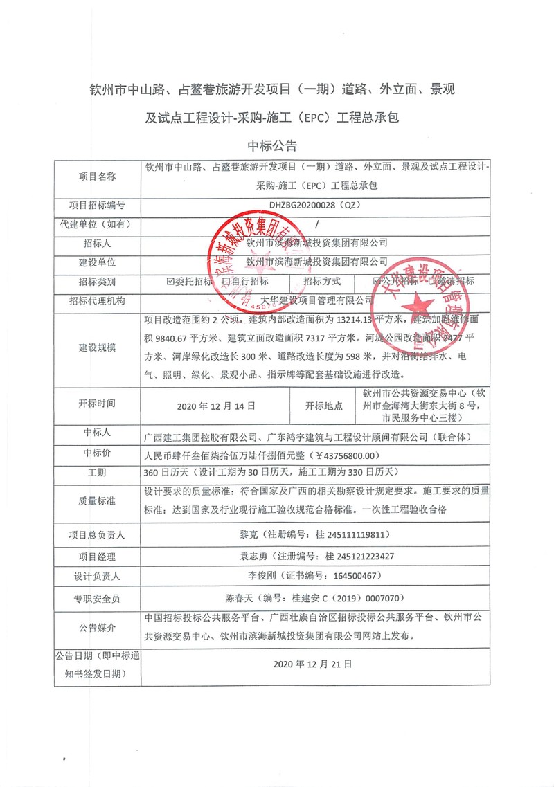 中標(biāo)公示-欽州市中山路、占鰲巷旅游開發(fā)項(xiàng)目(一期)道路、外立面、景觀及試點(diǎn)工程設(shè)計(jì)-采購-施工(EPC)工程總承包中標(biāo)公告