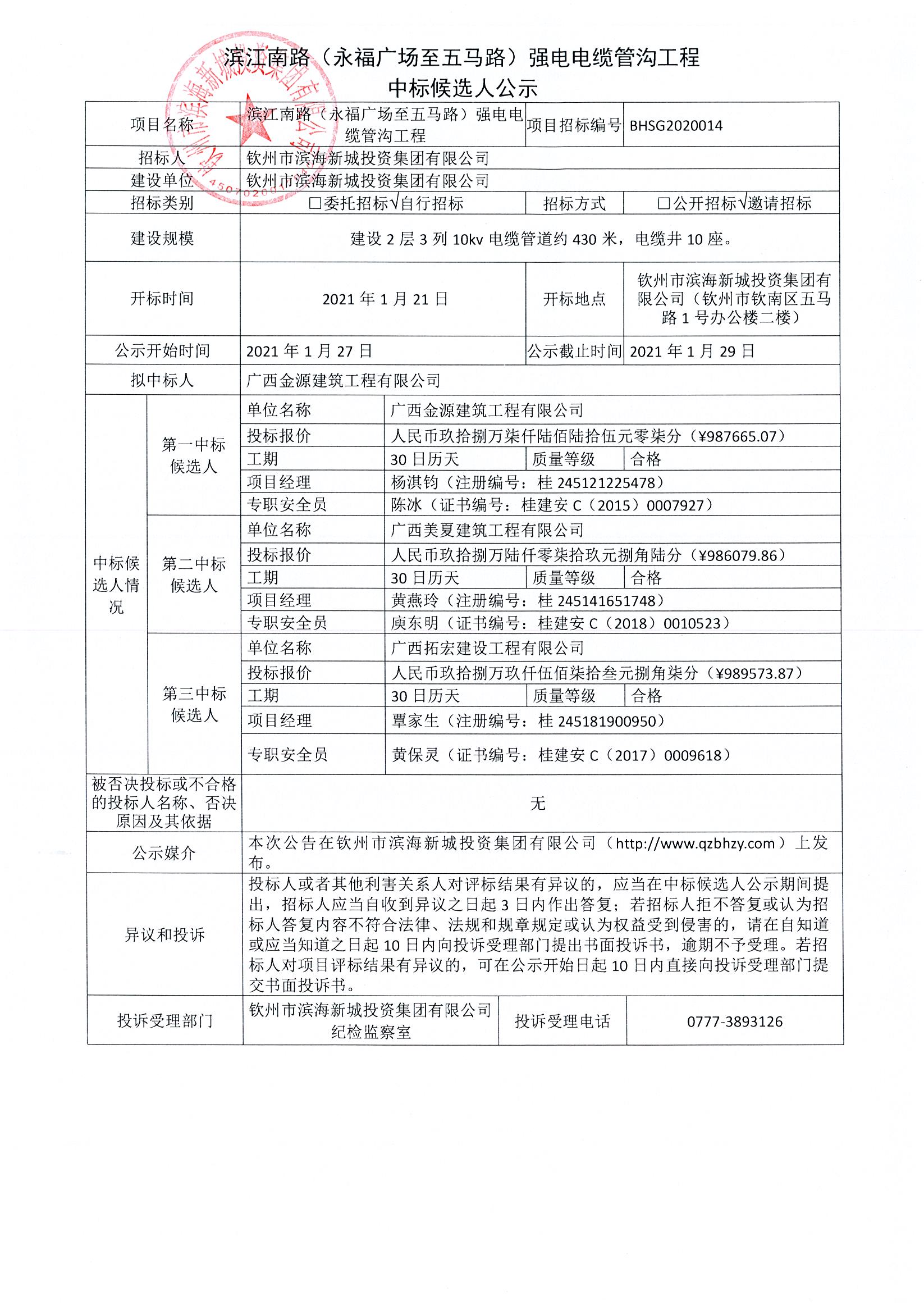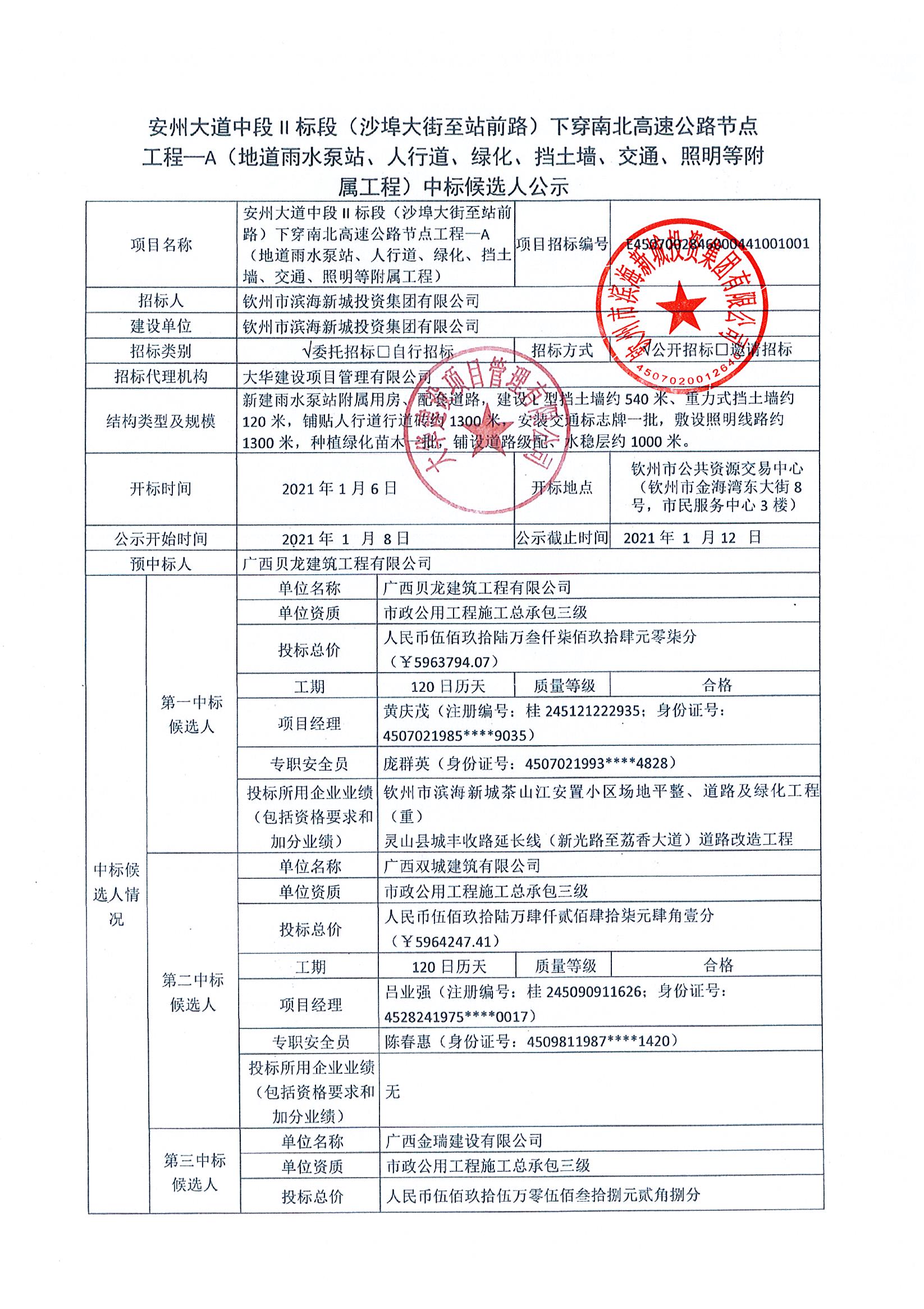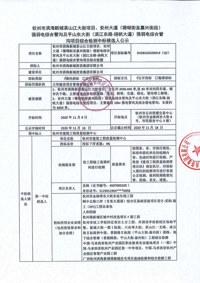 欽州市濱海新城茶山江大街項(xiàng)目、安州大道(珊瑚街至嘉興街段)強(qiáng)弱電綜合管溝及平山東大街(濱江東路-揚(yáng)帆大道)強(qiáng)弱電綜合管溝項(xiàng)目綜合檢測(cè)中標(biāo)候選人公示