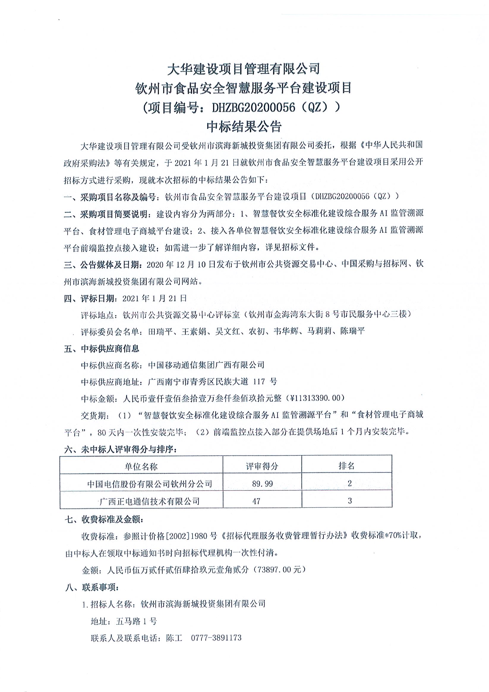 欽州市食品安全智慧服務(wù)平臺(tái)建設(shè)項(xiàng)目中標(biāo)結(jié)果公告