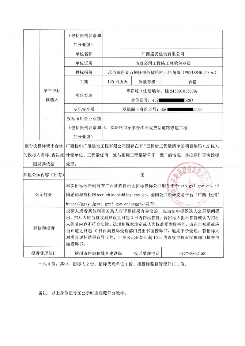 欽州市老舊城區(qū)改造提升項目中山路、占鰲巷道路改造及占鰲巷8號房屋加固修繕工程-中標(biāo)候選人公示