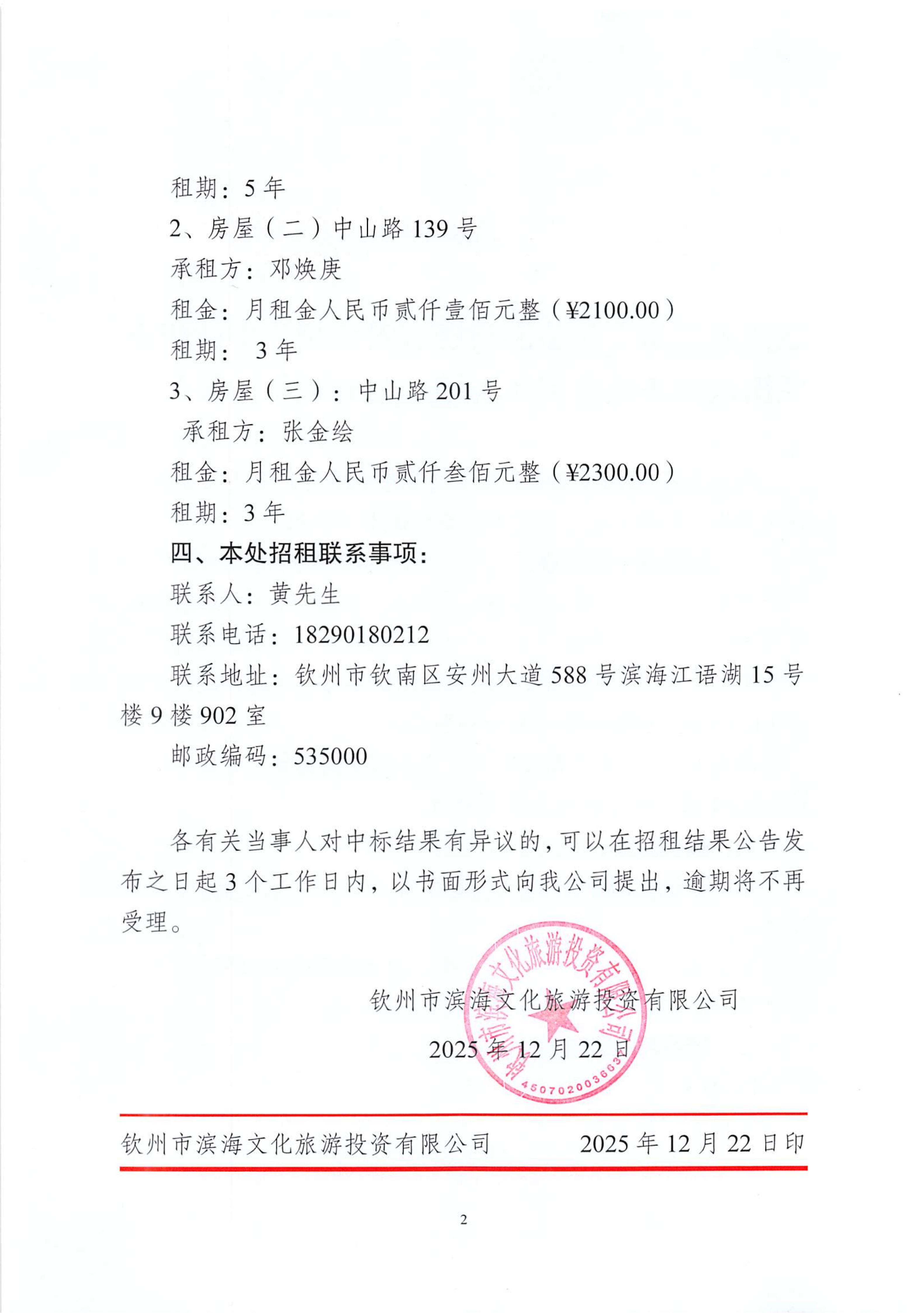欽州市濱海文化旅游投資有限公司關于欽州市老街范圍3處房屋(場地)公開招租結果公示(沙尾街20號、中山路139號、中山路201號)